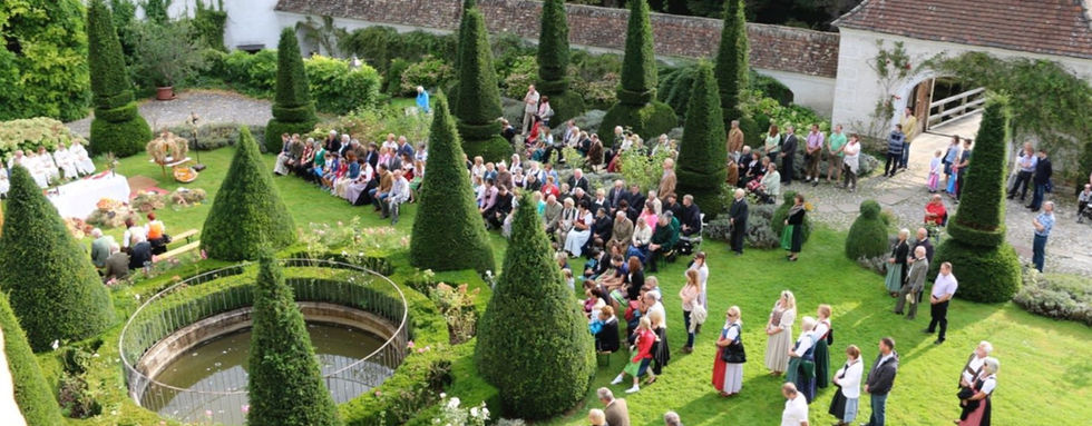 Ein Schloss umgeben von Wasser, über der Brücke ein stilvoller Innenhof mit Garten und Springbrunnen und rund um den See besondere Plätze für unvergessliche Momente: